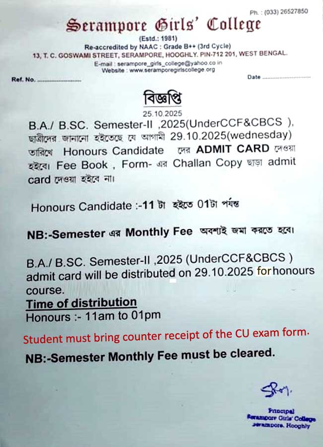 Admit Card Distribution to Honours Candidates (2nd sem exam CCF and CBCS)