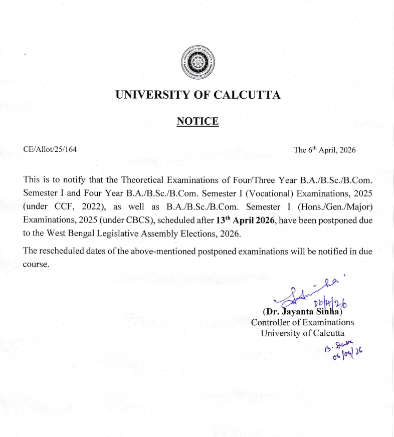 Notice for postponement of Theoretical Examinations of Four/Three Year B.A./B.Sc./B.Com. Semester I and Four Year B.A./B.Sc./B.Com. Semester I (Vocational) Examinations, 2025 (under CCF, 2022), and B